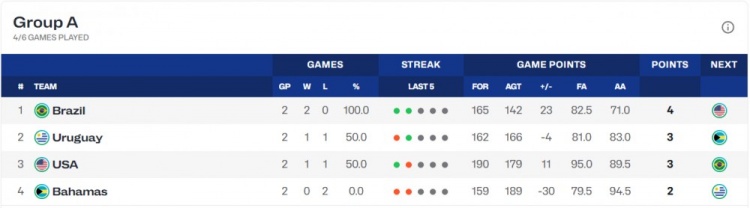 输给乌拉圭之后,美国男篮的出线形势急转直下,目前他们1胜1负排在小组第三,小组赛最后一场,他们要打强敌巴西男篮。