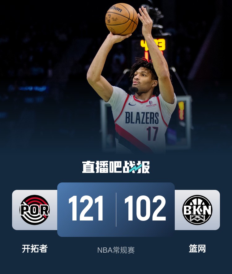 开拓者(27-33):夏普25分4板5助、班顿23分8板1助、卡马拉19分3板4助、安芬尼-西蒙斯14分3板6助、克林根12分7板3助2帽、亨德森12分3板9助3断、穆雷11分2板1助3断、沃克5分6板3助2断