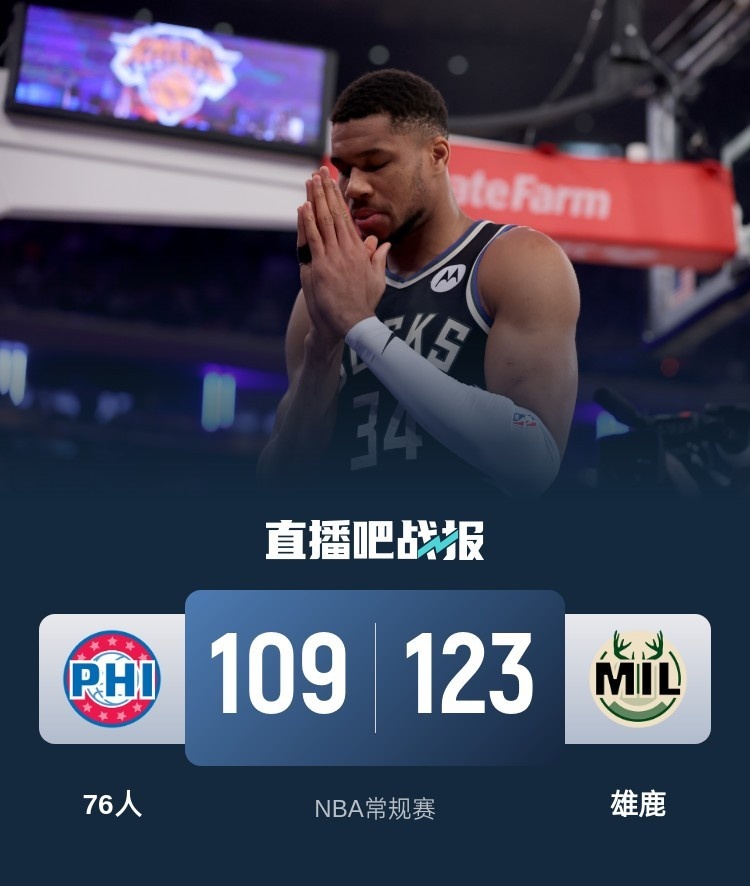 比赛上来,两队打得还是比较胶着,场上多次出现平分,不过在首节后半段雄鹿还是占据上风并建立起两位数的领先优势,次节76人一波15-2的小高潮直接完成反超,不过在节末的两分钟时间里他们一分未得,雄鹿连拿七分结束半场;下半场回来,雄鹿一直占据着场上主动,分差也是保持在十分左右,76人没有获得任何逆转的机会,最终雄鹿轻取76人,迎来四连胜的同时也送给后者六连败。