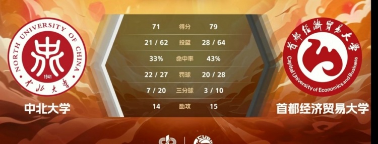 第四节,中北大学进攻再度陷入停滞,首都经贸大举反击,多点开花轰出15-4的攻击波一举将分差追到只差1分,朱睿泽两罚全中带队反超,双方争夺陷入白热化,关键时刻薛海海连中2记三分率队轰出8-0的攻击波,符骏抢断反击得手杀死比赛。最终,首都经贸凭借末节29-9的出色表现,79-71逆转战胜中北大学。