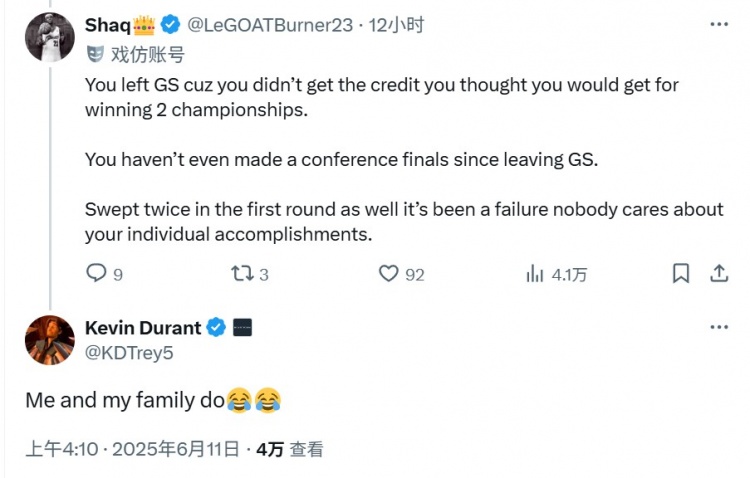 网友:“你离开金州勇士队是因为你认为自己赢下2次总冠军却没有得到应有的认可。离开金州勇士队后,你甚至从未打进过分区决赛。还两次在首轮被横扫,这是一次失败的经历,没人在乎你的个人成就。 ”