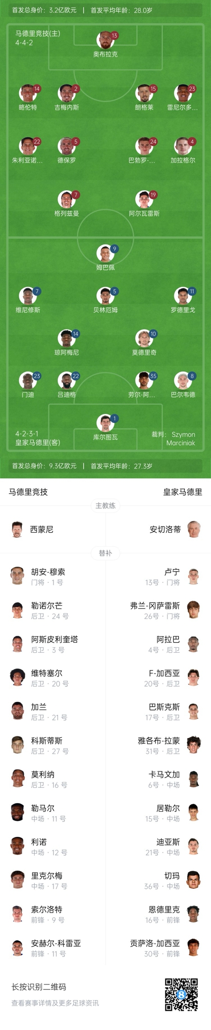 马竞首发:13-奥布拉克、14-略伦特、2-吉梅内斯、15-朗格莱、23-雷尼尔多、22-西蒙尼、5-德保罗、8-巴里奥斯、4-加拉格尔、7-格列兹曼、19-阿尔瓦雷斯