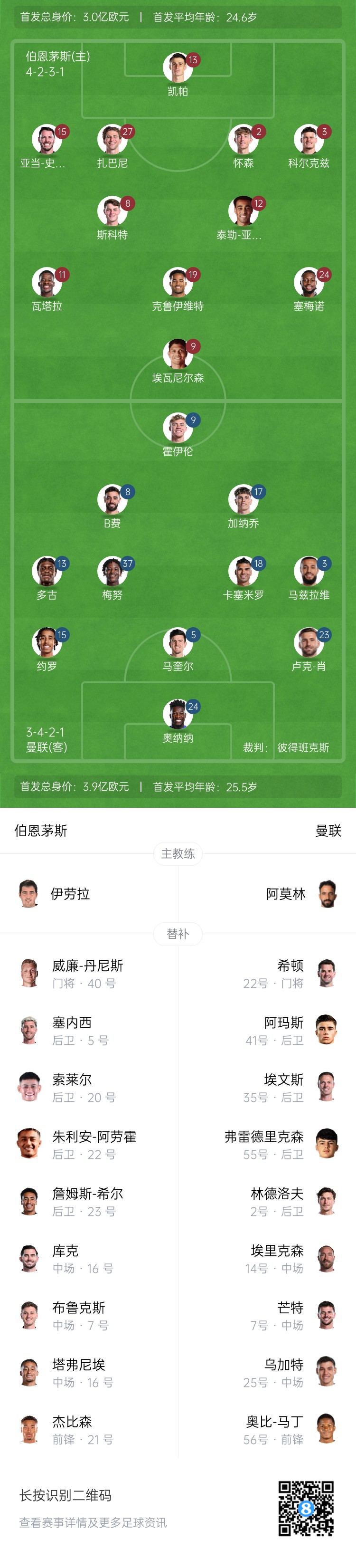 曼联首发:24-奥纳纳、3-马兹拉维、5-马奎尔、13-多古、15-约罗、23-卢克-肖、8-B费、18-卡塞米罗、37-梅努、9-霍伊伦、17-加纳乔