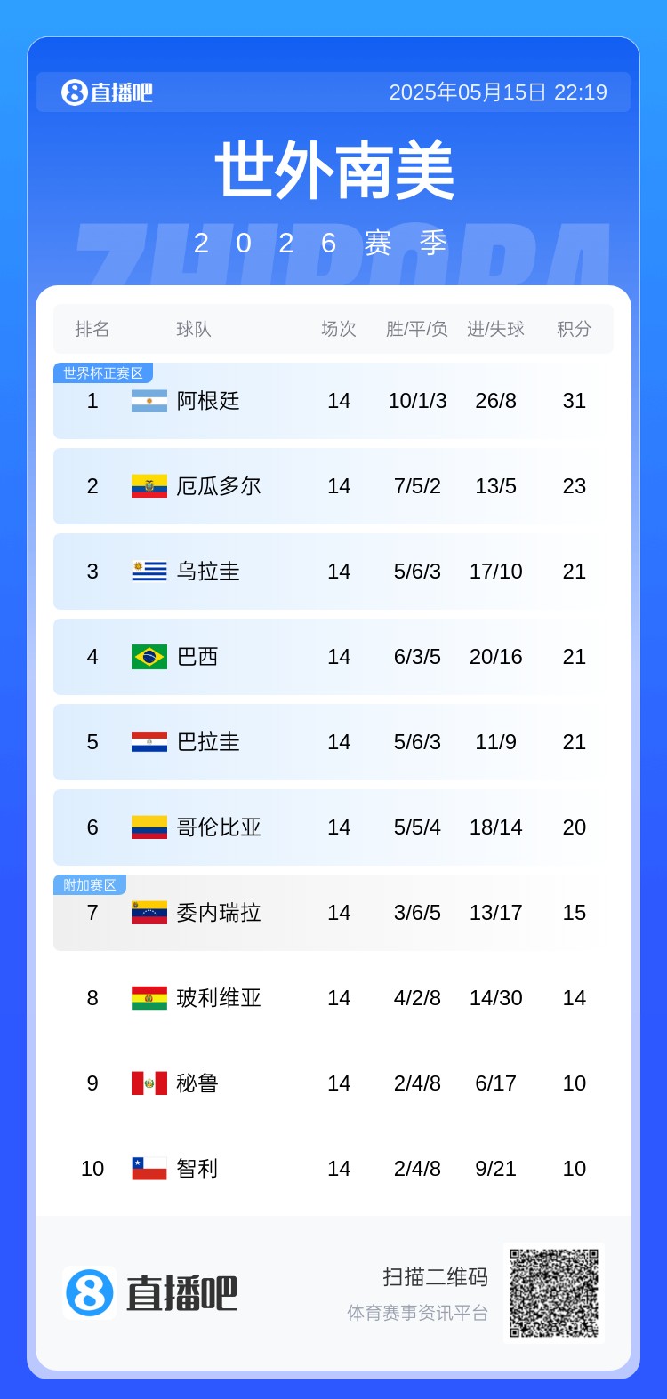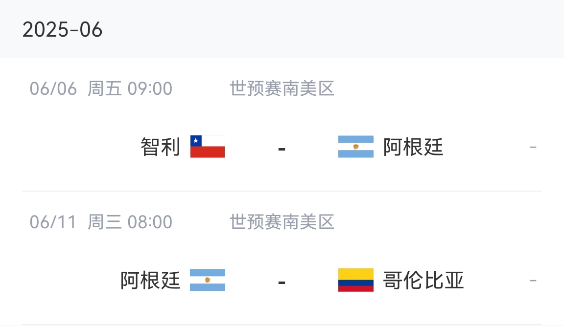 6月份的两场世预赛,阿根廷将先后交手智利和哥伦比亚。目前在世预赛南美区积分榜上,阿根廷排名第一,已经提前晋级2026年世界杯。