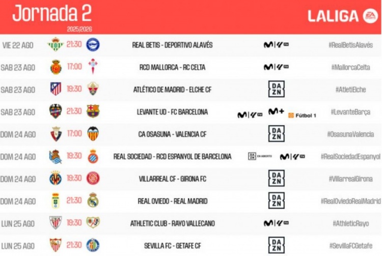 7月10日讯 今天,西甲联盟在官网公布了西甲第二轮的比赛对阵,皇马和巴萨均在客场对阵本赛季的升班马球队。