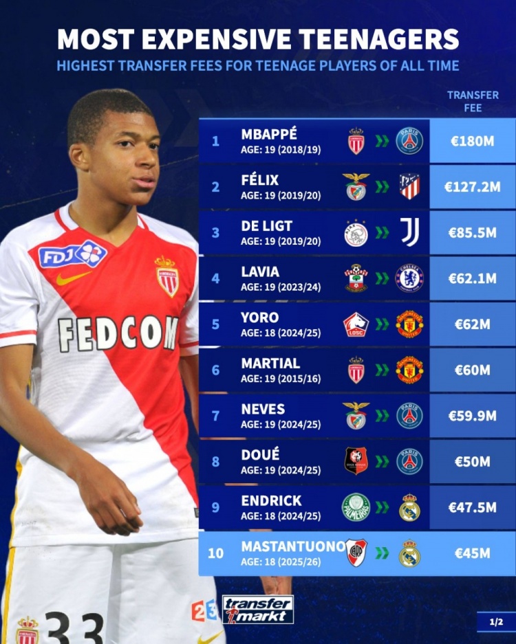 8月5日讯 德国转会市场统计了足坛历史U20球员(不包含20岁)的转会费,并列出榜单,姆巴佩、菲利克斯、德里赫特排名前三。